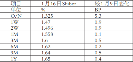 上周,国内市场利率整体上呈现上升态势。一方面,随着春节临近,资金需求阶段性上升,短期利率走强;另一方面,国内股市表现良好,大宗商品也触底反弹,市场信心修复,投资需求上升,中长期利率稳中有升。截至1月16日,上海银行间同业拆放利率(Shibor)隔夜、1周期、2周期、1月期、3月期、6月期、9月期、1年期利率分别报收于1.325%、1.47%、1.496%、1.558%、1.6%、1.62%、1.64%、1.65%,较1月9日上升5.3、0.9、0.9、0.1、0.5、0.2、0.5、0.4个基点。