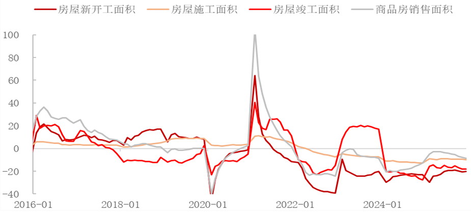 图为国内房屋新开工、竣工、销售面积增速(单位:%)