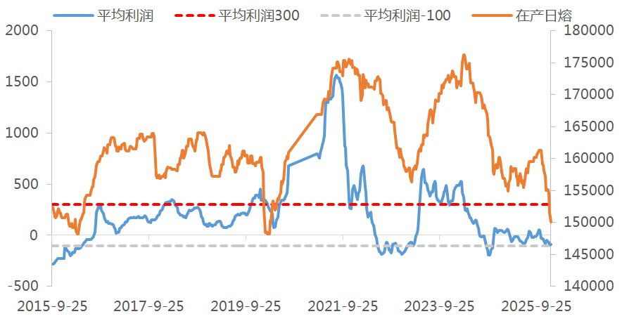 图为2015—2025年国内浮法玻璃平均利润与在产日熔量(单位:元/吨、吨)
