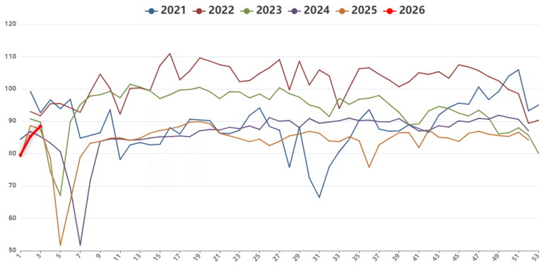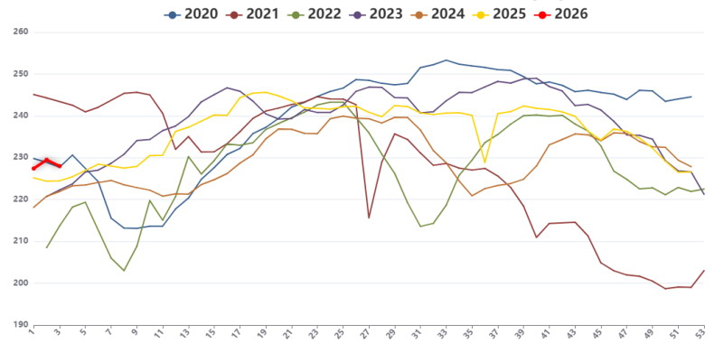 从供应端来看,进入2026年1月,前期停产、减产的煤矿陆续复产,焦煤产量逐步回升。钢联统计的523家炼焦煤矿山样本核定产能利用率已经由1月1日的79.6%恢复至88.5%,煤矿生产增量有序释放,供应相对充裕。近期,虽有内蒙古安全大检查和榆林限产的市场传言,但调研显示,相关企业反馈未收到正式文件。消息和情绪层面的影响可以使得价格短暂上涨,但毕竟难以持续。进口方面,蒙古国焦煤供应持续处于高位,甘其毛都口岸监管区库存接近400万吨。在期货盘面走弱的背景下,下游询盘积极性下降,贸易商报价有所松动。澳大利亚远期海外炼焦煤一线主焦CFR报价244.0美元/吨,比上一交易日上涨2.0美元/吨。受强降雨天气和洪水影响,澳大利亚煤矿矿井被淹,主要煤炭生产商宣布因不可抗力,产量受到严重影响。俄罗斯远期炼焦煤市场个别主流煤种报价坚挺,但整体延续僵持态势,采购方态度较为谨慎。