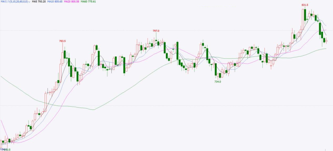近期,铁矿石2605合约价格最高上涨至831.5点一线后,逐步走弱,并连续跌破短期均线支撑。量能方面,在价格回落过程中,成交量一度放大,持仓量有所下滑。指标方面,短期均线跟随价格走势转弱,20日均线和60日均线处于水平走势。MACD指标快慢线交出死叉后,同样走弱。综合来看,铁矿石2605合约价格冲高回落,走势转弱,下方关注60日均线支撑力度。