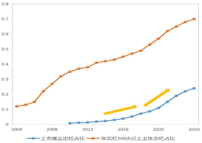 相关数据显示,2025年10月末,能繁母猪存栏量首次降至3990万头,12月末继续下降至3961万头,产能去化呈现“徐行”特征。这一现象与产业规模化程度的提升密切相关,企业更注重长期发展趋势与综合效益,短期价格波动不会改变规模化与效率提升的长期发展主线。从历史数据看,行业内年出栏500头以上主体的出栏量占比由2004年的12%逐步提升至2024年的70%,且在经历了两轮行业集中度加速提升后,2024年上市猪企市占率已到达24%的较高水平,生猪行业规模化程度已行至高位,产能去化呈现渐进式特征。