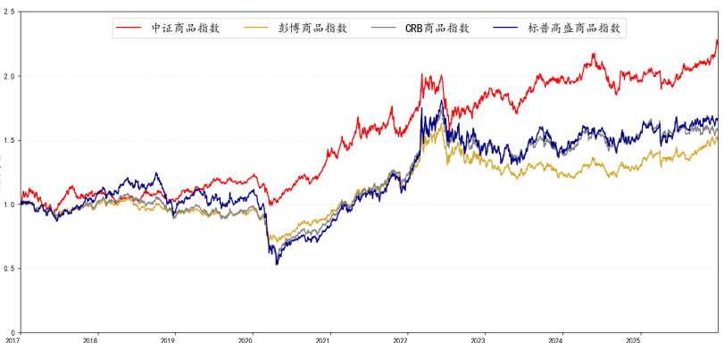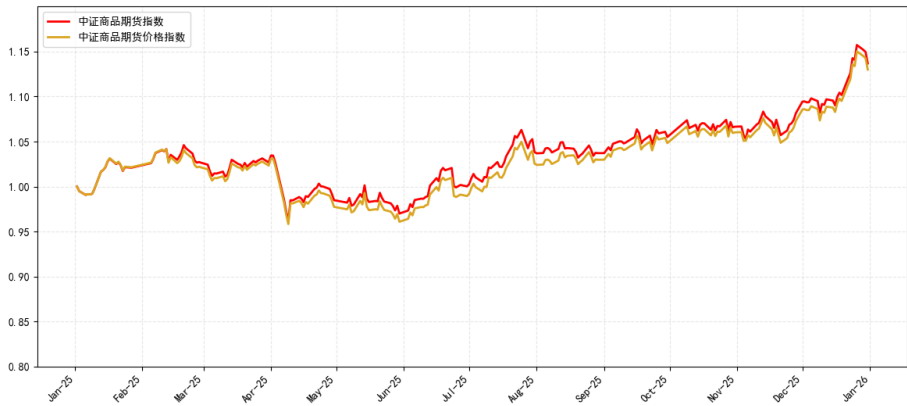 2025年中证商品期货指数涨幅显著,且于四季度进入加速上行通道,年末接近历史高点,反映出2025年商品市场呈现探底回升、前低后高的走势。具体来看,指数上半年以震荡筑底为主,4月展开回调,5—8月稳步抬升,9月后加速上涨,年末则维持在高位区间运行。