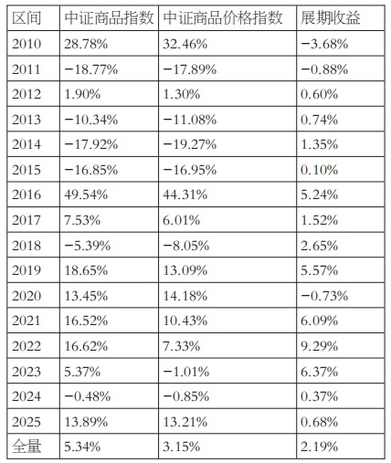 从2025年相关数据表现来看,商品市场的驱动逻辑直接影响展期收益表现:当走势由基本面现实逻辑主导时,展期收益通常同步呈现出较大正向贡献;而当宏观预期逻辑主导时,展期收益则往往表现有限。2025年,中证商品指数上涨13.89%,而展期收益仅录得0.68%的小幅正贡献,这恰恰印证了当年行情主要由宏观预期所驱动。