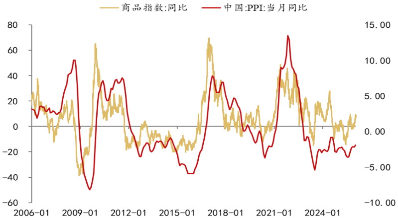 商品指数波动通常领先PPI约两个月,这一规律在2025年再次得到印证——商品指数同比于4月见底,PPI同比则于6月触底,此后二者同步进入回升通道,2026年通胀回升的逻辑将持续延续。