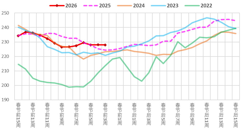 与供应平稳运行不同,焦炭需求表现偏弱。新年伊始,钢厂曾有所复产,但因终端需求季节性走弱,产业矛盾不断累积,提产动能受限,相关原料需求同样承压。截至1月30日当周,钢联247家钢厂高炉开工率和产能利用率分别为79.00%、85.47%,低位回升但增幅不大,较上月末值分别微增0.06、0.21个百分点。相应的日均铁水产量最新值为227.98万吨,较上月末值微增0.56万吨,整体延续去年四季度以来的下行态势。