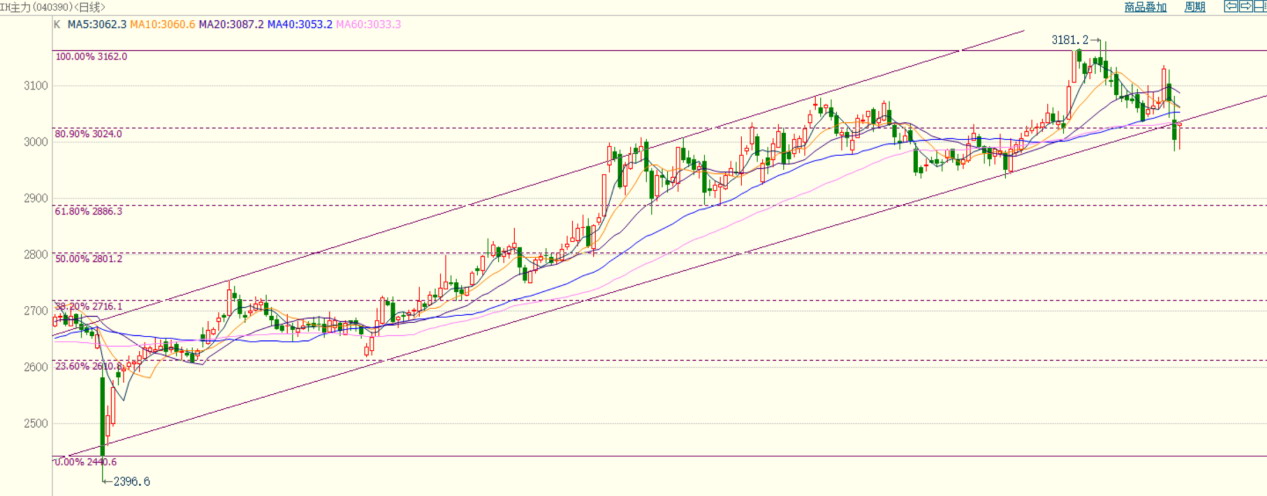 近期,IH主力合约创出近4年以来的新高后转头回落,并跌破上涨通道下沿和黄金分割0.809对应的3000点的支撑位。均线方面,短期均线下穿长期均线。指标方面,MACD指标、KDJ指标死叉,给出趋势看空信号;RSI指标低位黏合。量仓方面,近期价格下跌过程中伴随着减仓缩量,说明下跌主要由多头获利了结所致。综合分析,后续若IH向下放量形成有效突破,则走势将转弱。