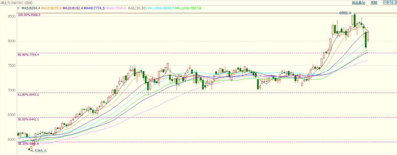IM主力合约创出8568点的上市新高后转而回落,近期开始检验黄金分割0.809对应的7750点的支撑有效性。均线方面,短期均线下穿长期均线,说明走势转弱。指标方面,MACD指标死叉,给出看空信号。量仓方面,近期价格下跌过程中量能小幅收缩。综合分析,IM将在7750点反复。