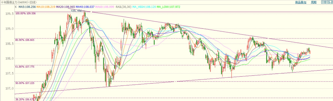 T主力合约创出109.59点的上市新高后上涨乏力,逐渐走出一个三角形形态。近期,价格上涨至三角形上沿。均线方面,短期均线上穿长期均线,均线系统转为多头排列。指标方面,MACD指标金叉,给出看涨信号;KDJ指标、RSI指标死叉,说明短期存在回调需求。量仓方面,近期价格的上涨伴随着增仓放量,上涨动能增强。综合分析,T处于三角形之中,KDJ、RSI指标走弱,向上突破的难度较大,预计后续延续震荡走势。(弘毅物产 黄李强)