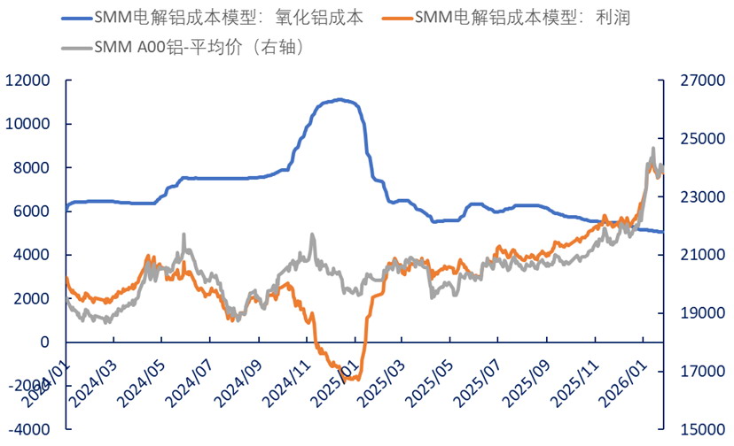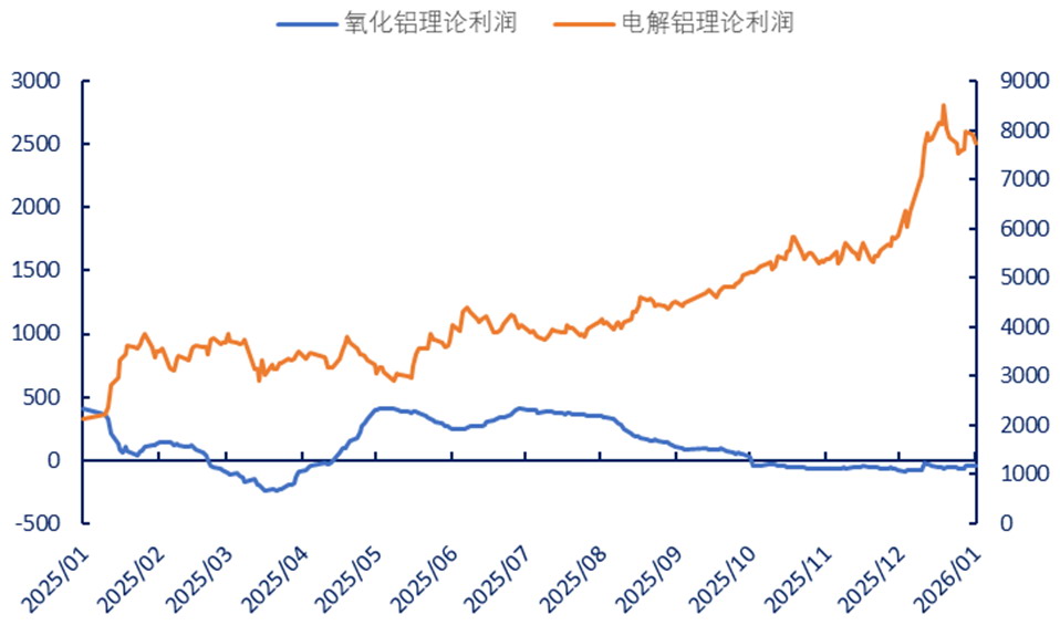 最近一年的数据将这种背离放大到极致:氧化铝期货价格下跌25%,同期电解铝期货价格则强势上涨20%。氧化铝理论利润下跌111%,电解铝理论利润上涨264%。2026年以来,这种分化趋势持续扩大。