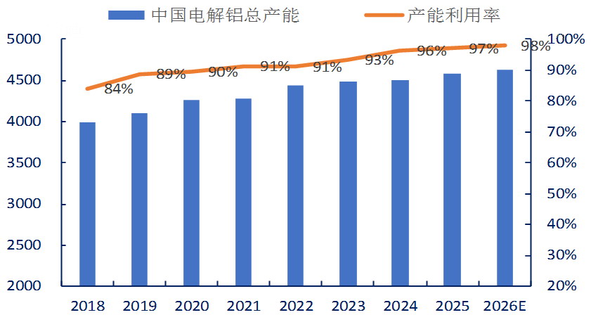 图为电解铝产能及产能利用率(单位:万吨)