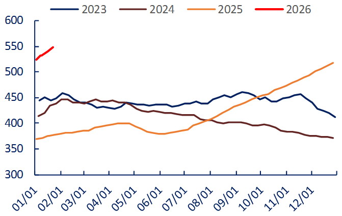 反观氧化铝,2025年氧化铝产能利用率不到80%,在供应过剩的背景下,国内产能仍在持续释放,仅2026年一季度就有百万吨级新产能投放,主要集中在广西地区。叠加海外低价货源持续流入,氧化铝供应压力巨大,社会库存攀升至历史同期新高。海外增量主要来自印度尼西亚及印度,其依托本地铝土矿资源及成本优势,吸引多家企业投资建厂,是未来增量的核心区域,全年增量在200万吨以上。