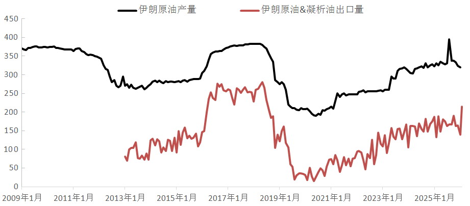 图为伊朗原油产量、原油及凝析油出口量(单位:万桶/日)