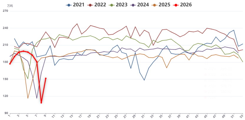 春节期间炼焦煤市场呈现典型的供需双弱格局。受春节假期与安全生产管控升级的双重影响,国内炼焦煤矿山大面积停产,主产区山西的产能利用率大幅下滑,民营煤矿提前放假进一步加剧了供应收缩程度。进口端,由于蒙古口岸春节期间闭关、海运煤内外盘价差倒挂,短期出现进口供应中断、到港量同比走低的情况。虽然供应处于近几年春节同期的低位水平,但需求疲软程度超过供应收缩的幅度。下游焦钢企业春节前已完成冬储补库,焦化企业库存维持中性偏高水平,春节假期期间企业均以消耗库存为主。叠加公路物流运输暂停,炼焦煤采购近乎停滞。
