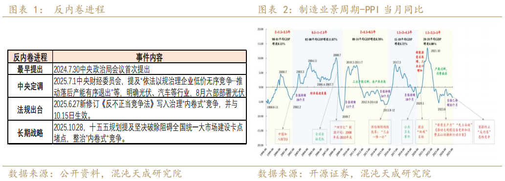 此轮反内卷最早于2024年7月中央政治局会议提及,在2025年7月的中央财经委员会第六次会议提及“依法以规治理企业低价无序竞争…推动落后产能有序退出”等,进一步明确了反内卷的政策路径。同时在2025年两会期间,总书记再度强调破除地方保护与市场分割;政府工作报告首次将“综合整治内卷式竞争”纳入关键任务。十五五规划,也把“反内卷”纳入顶层设计。