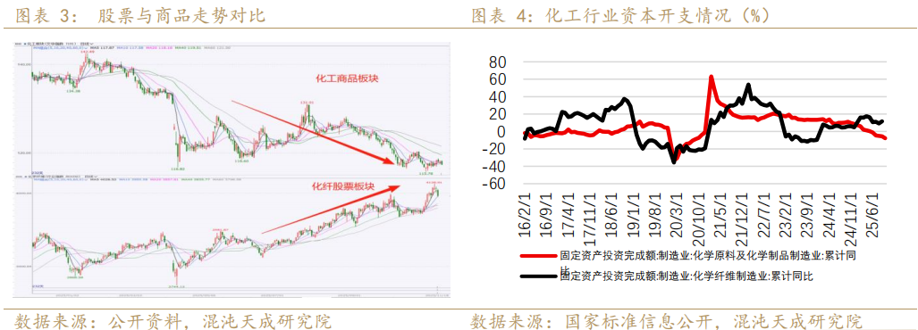 就化工板块而言,今年股票板块和商品期货走出了近乎完全相反的走势。核心区别是股票市场关注的景气周期出现拐点:资本开支持续下降,海外产能退出加速,此时反内卷的提出,市场预期供给侧收紧将加速,行业走出周期的时间将提前。但对于商品来说,交易的周期偏短,核心的成本(原油今年下跌20%)与供需(目前限产主要为少数行业自律,新投产限制未加强,淘汰暂未落地)均未有趋势扭转的信号出现,因此除了个别基本面较好品种(如PX),多数仍处于趋势下行压利润状态。