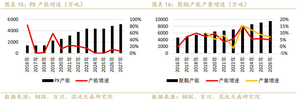 PX作为PTA成本端,近两年的偏紧结构,截留了产业链的最高利润。而且这一趋势仍将持续到明年三季度,直至新投产兑现才会有所缓和(2026年实际投产可能仍不及预期,目前跟踪只有华锦阿美200万吨,明年三季度投产年底放量概率较大;裕龙300万吨仍可能继续延期;九江150万吨预计延期至2027年)。其核心原因是近两年PX无新增投产,而下游聚酯仍保持10%左右的增速,因此带来的硬缺口,在每年的Q2检修季,缺口体现的最明显。