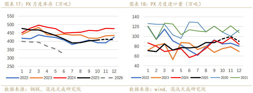 需求端核心还是看聚酯及终端纺服情况,受消费周期特性、宏观环境、竞争等因素,对2026年仍对纺织服装增速持平稳看待,对聚酯增速略下调。通过以上情况线性外推来看,明年二季度PX将去库至历史低位水平。如果说PTA是需要通过反内卷协同来完成格局转换,PX就是自身硬缺口支撑产业链的成本端。