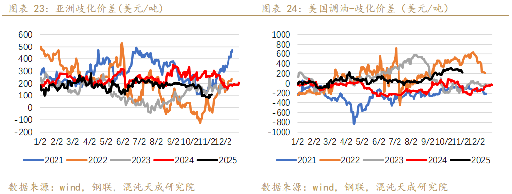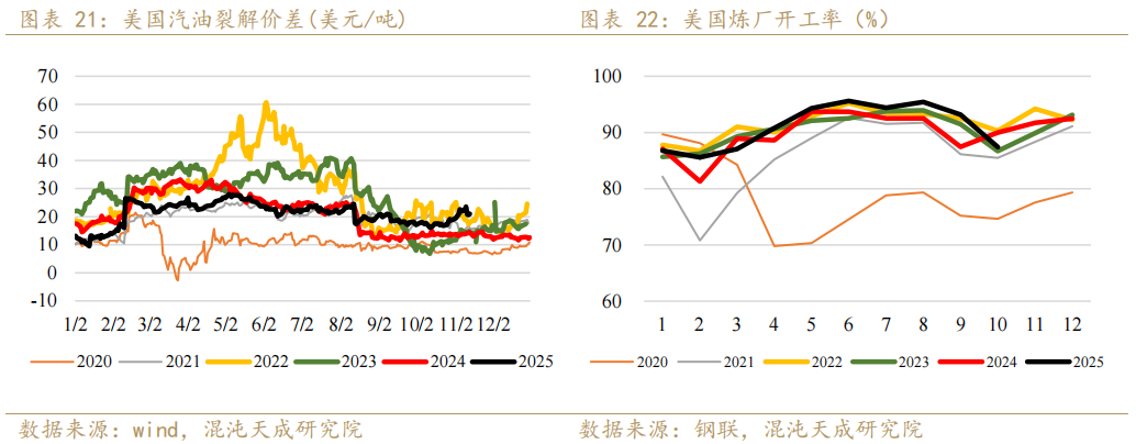 调油方面,2022年为最高峰,近几年影响逐步弱化,今年初实际就未再出现调油行情(季节性4-7月美国出行高峰,调油旺季,调油备货一般在年初甚至更早开始)。但10月下旬开始美国裂解价差快速上行,回升至近五年季节性高位再次引发了市场对调油预期。