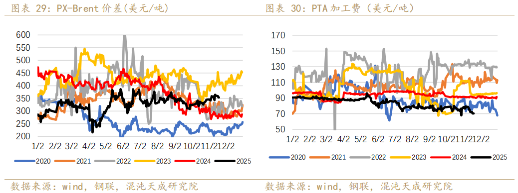 而策略角度看,当前原油仍有大跌风险,多化工建议配置空原油保护。若原油有信号见底或反弹,再择机单多PX、PTA;如果反内卷有望推进落地,则以PTA为主要低多标的。价差方面做阔PTA加工费,有安全边际,需要见到反内卷达成;做阔PX利润性价比暂不高,需等待驱动叠加(以2023年最高550美金看有200美金空间),等估值回调可考虑。
